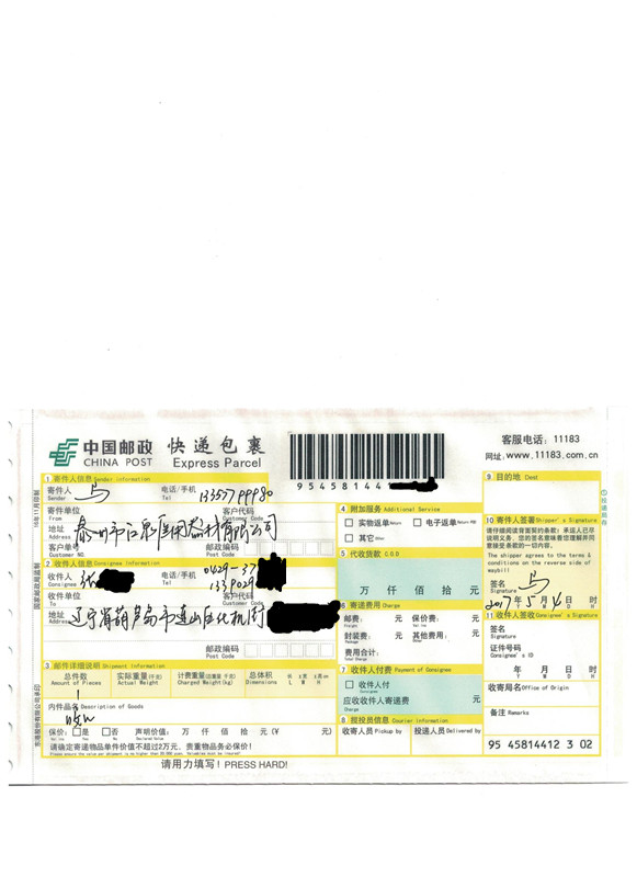 递发出,请注意查收。邮政快递会送 货上 门,请耐心等候。增值税专用发票会随后寄出,请放心,期 待下次合作。