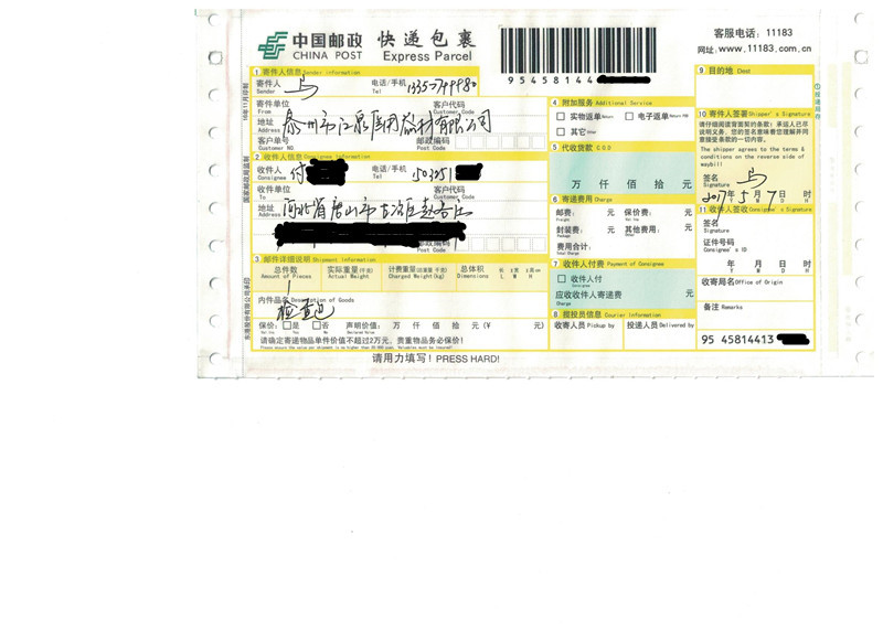 由邮政快递 发出,请注意查收。邮政快递会送 货上 门,请耐心等候。增值税专用发票会随后寄出,请放心,期 待下次合作。