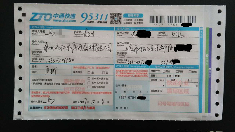 由中通快递发出,请注意查收。中通快递送 货上 门,请耐心等候。增值税专用发票会随后寄出,请放心,期 待下
