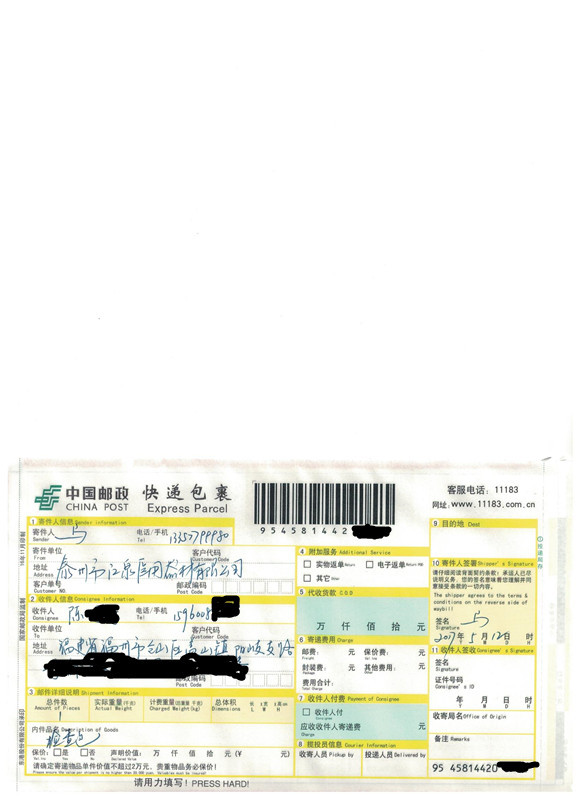 由邮政快递发出,请注意查收。邮政快递送 货上 门,请耐心等候。增值税专用发票按照你的意思随货同行,请注意