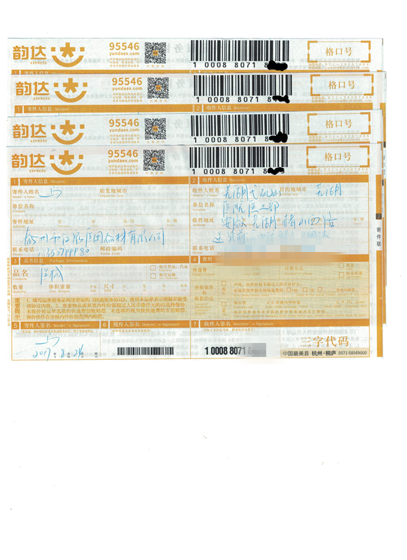检查包已经由韵达快递发出,请注意查收。韵达快递送 货上 门,请耐心等候。增值税专用发票按照你的意思寄往你的公司,